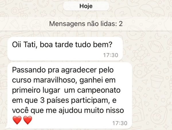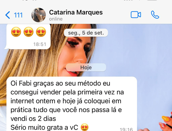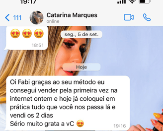 "Oi Fabi, graças ao seu método eu consegui vender pela primeira vez na internet ontem e hoje já coloquei em prática tudo que você nos passa lá e vendi os 2 dias. Sério, muito grata a você 😍" - Catarina Marques